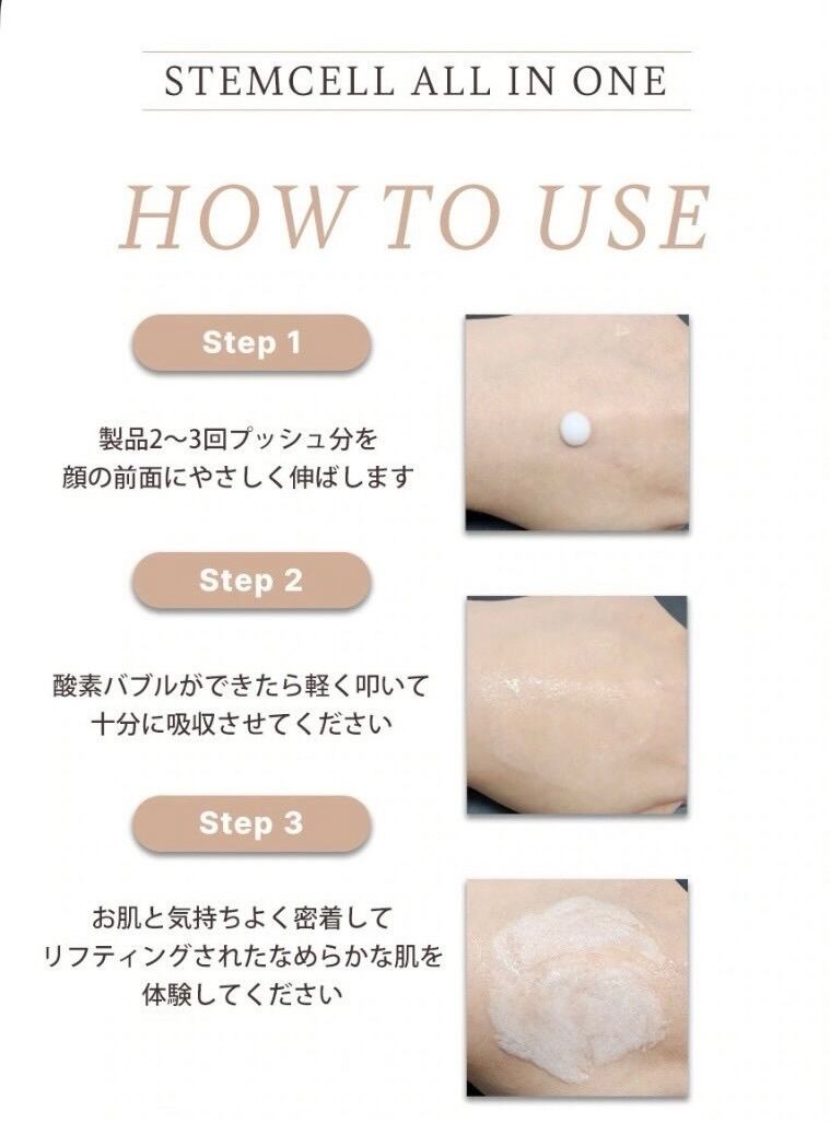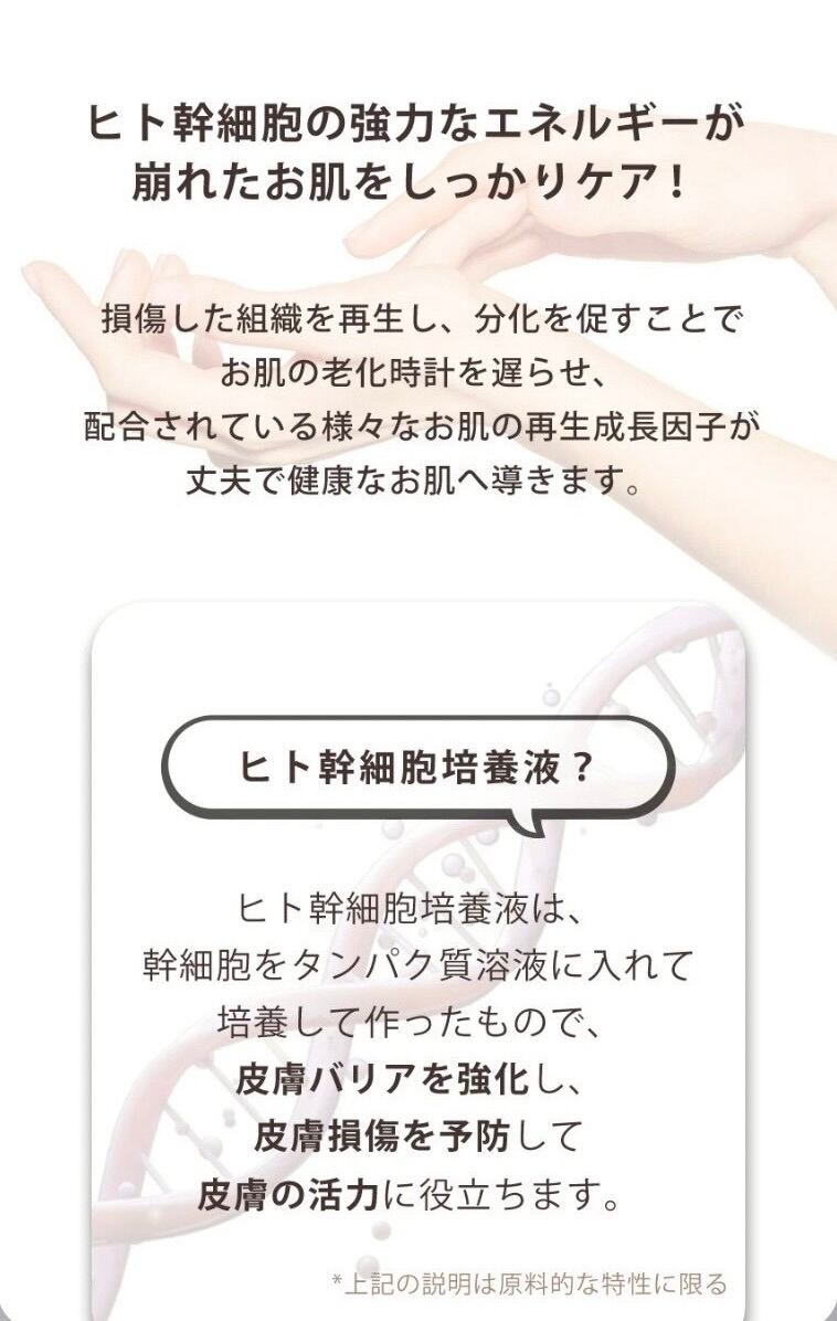 損傷した肌の再生と老化を遅らせる、ヒト幹細胞培養液5,000ppm含有。