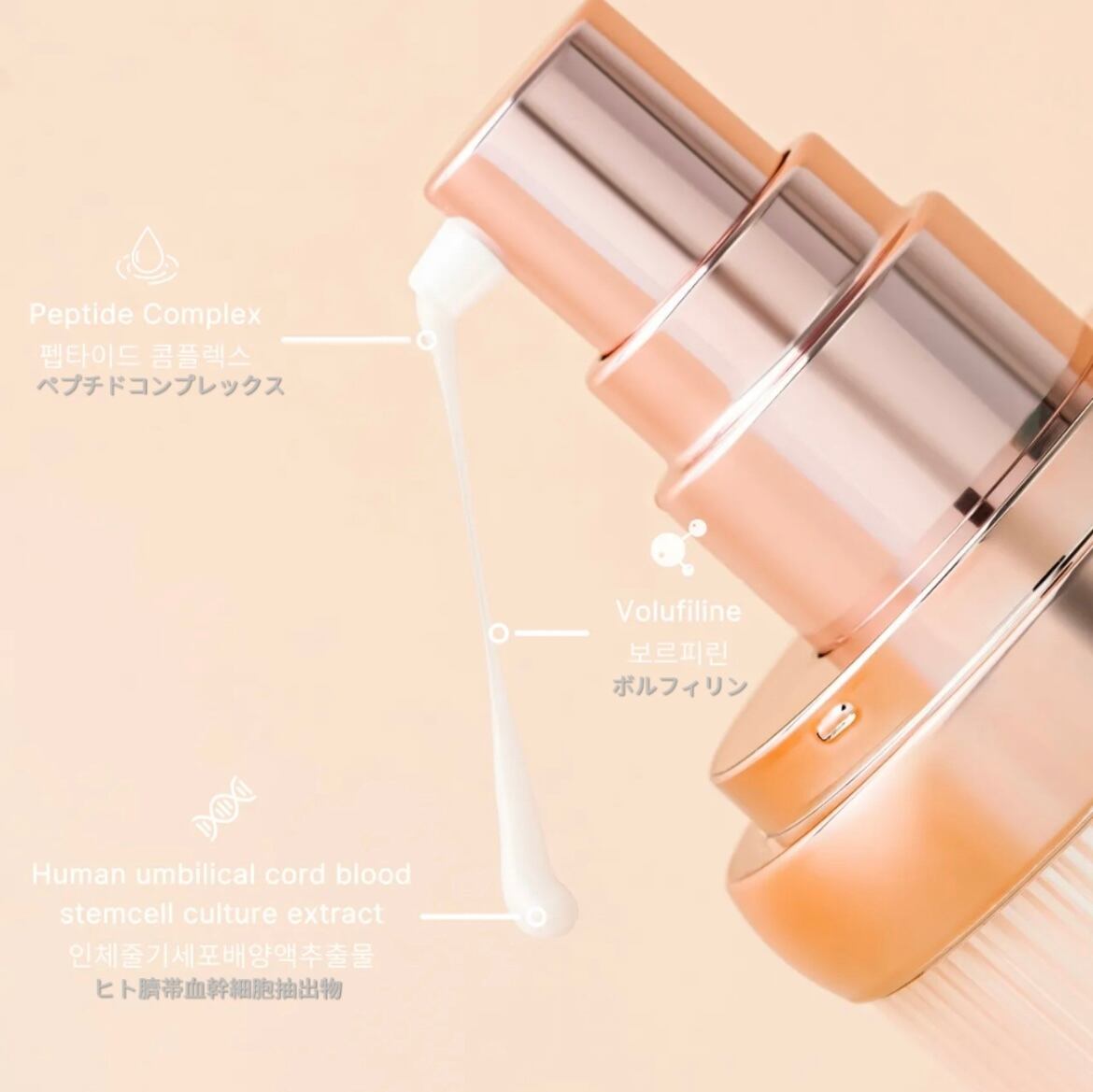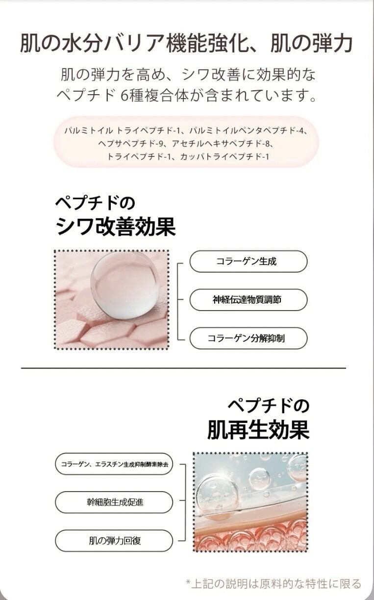 しわ改善と色素沈着改善に効果的な、”次世代植物性バクチオール”と”ペプチド6種複合体”が含まれている。